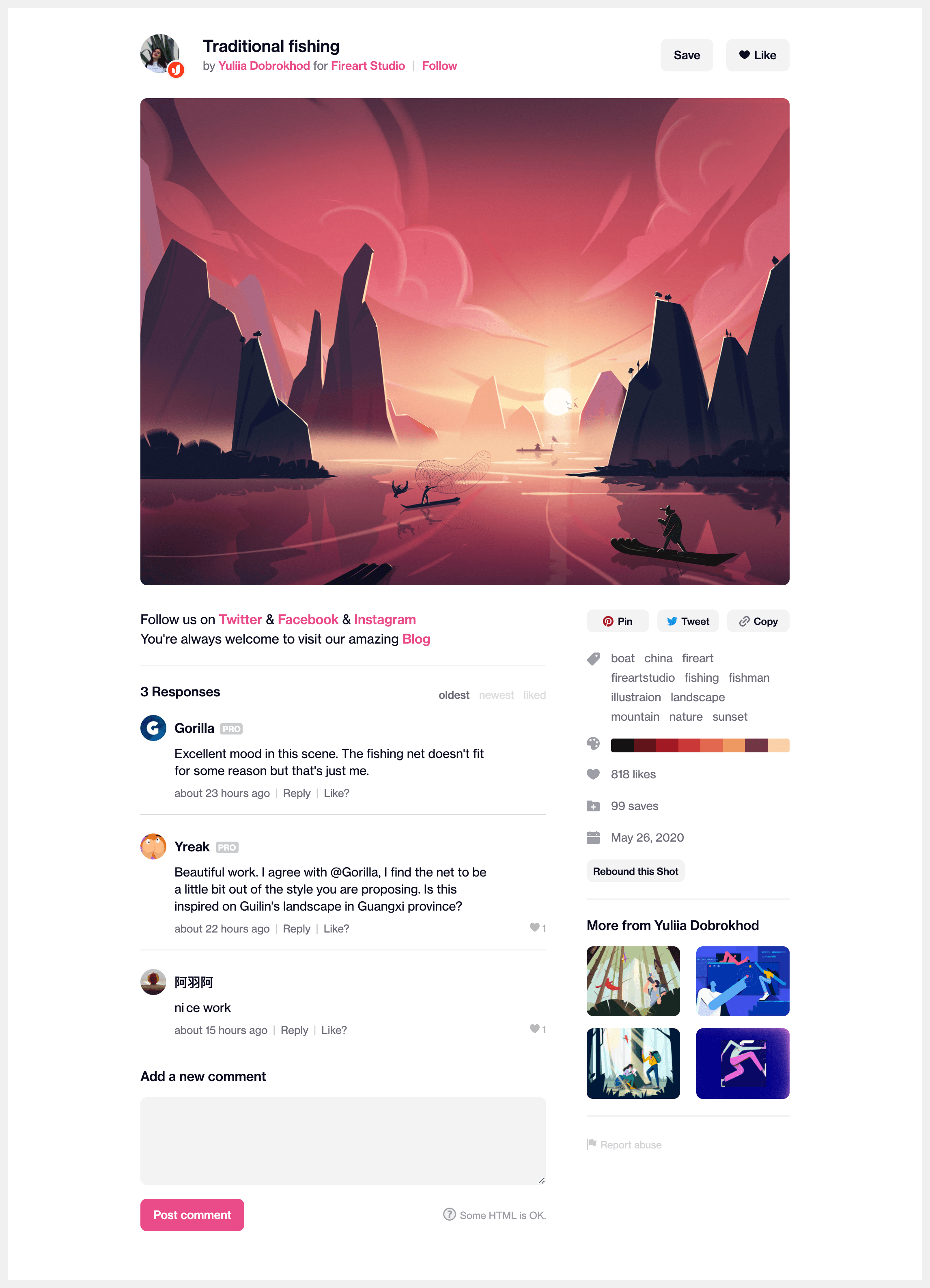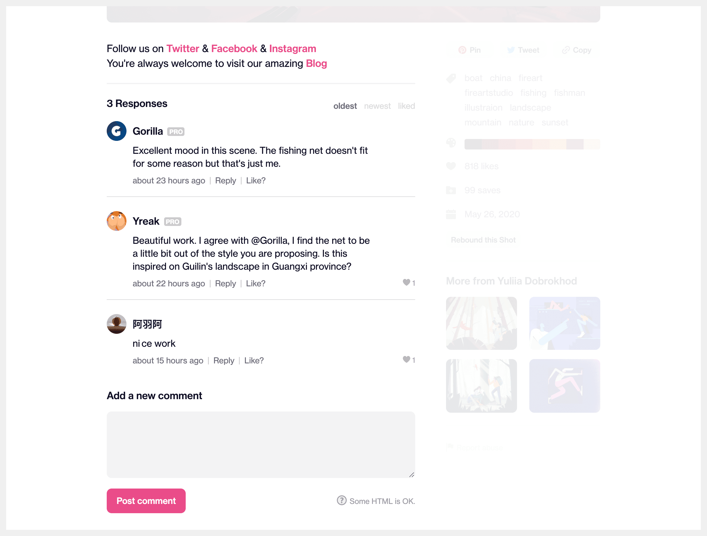 The most suitable page to use is going to vary by product, for Twitter I’ve used the homepage for logged-in users, likewise for Reddit. For Dribbble, I’m going with a Shot page. I’ve picked one more-or-less at random after browsing the site a bit. Like most individual examples, it doesn’t contain every possible element, but that’s not a problem.