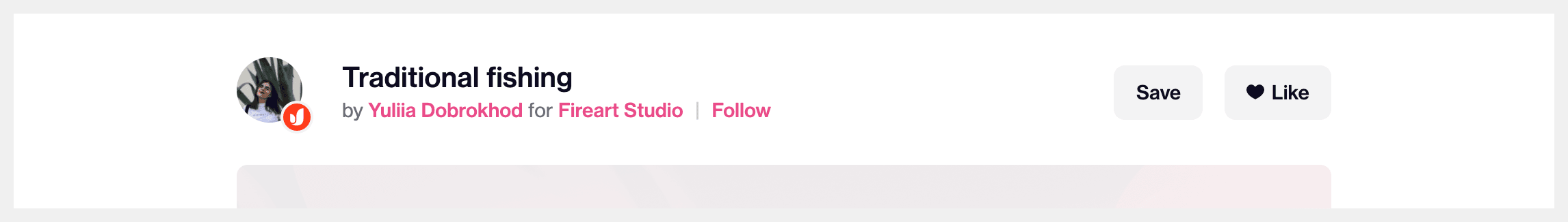 Above the main shot image, we can see a few pieces of content. The most obvious is the title of the shot. We can also see who created it (or posted it, if we’re being picky), and who commissioned it, the latter of which I know to be optional. There are two avatar images, with the creator being the larger image, and the commissioner being the smaller of the two. There are also buttons for following the creator, saving the shot, and liking the shot. The state of these buttons changes depending on whether the viewing user has their respective actions already.